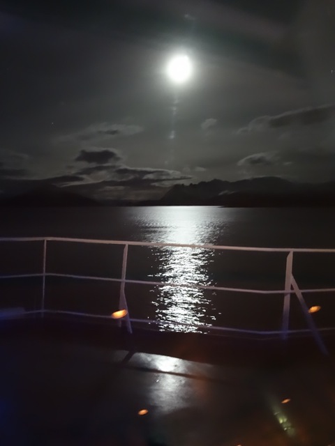 Then just as we are finishing up around 9pm, the tannoy announces that the Northern LIghts are visible from the stern and we all dash as a one for coats, hats and cameras and hurry to deck 5, which has a wrap-around outside deck. The air is cold and dry, the stars are bright, and we witness the most entrancing sight we have ever seen.